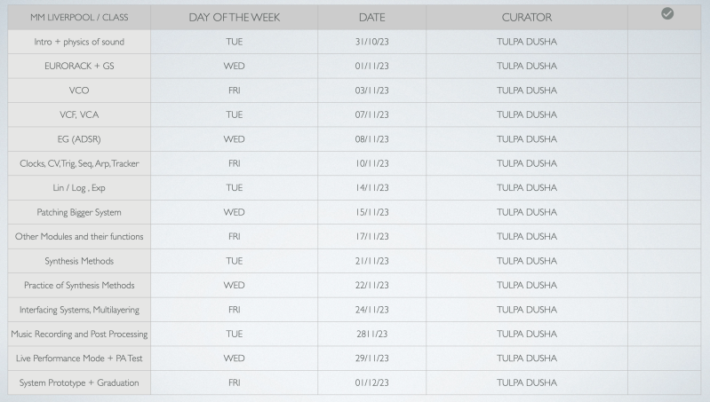 Here you can see detailed program, for the Cycle 1 Liverpool. Starting on 31 October 2023, three days a week, 3 hours per class. Every student will get a copy of Modular Sound Synthesis On the Moon, the book as a part of classes. During classes there will be synthesis systems provided to practice. Snacks and drinks provided.