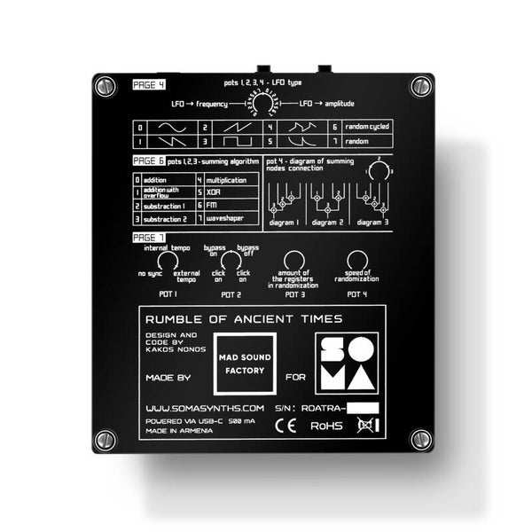 Rumble of Ancient Times was designed and programmed by Kakos Nonos, a new creative mind who joined the SOMA development team. His very unique style of building electronic musical instruments combines quality craftsmanship, advanced programming and a love for medieval acoustic instruments such as gusli, wheeled lyre and bagpipes.